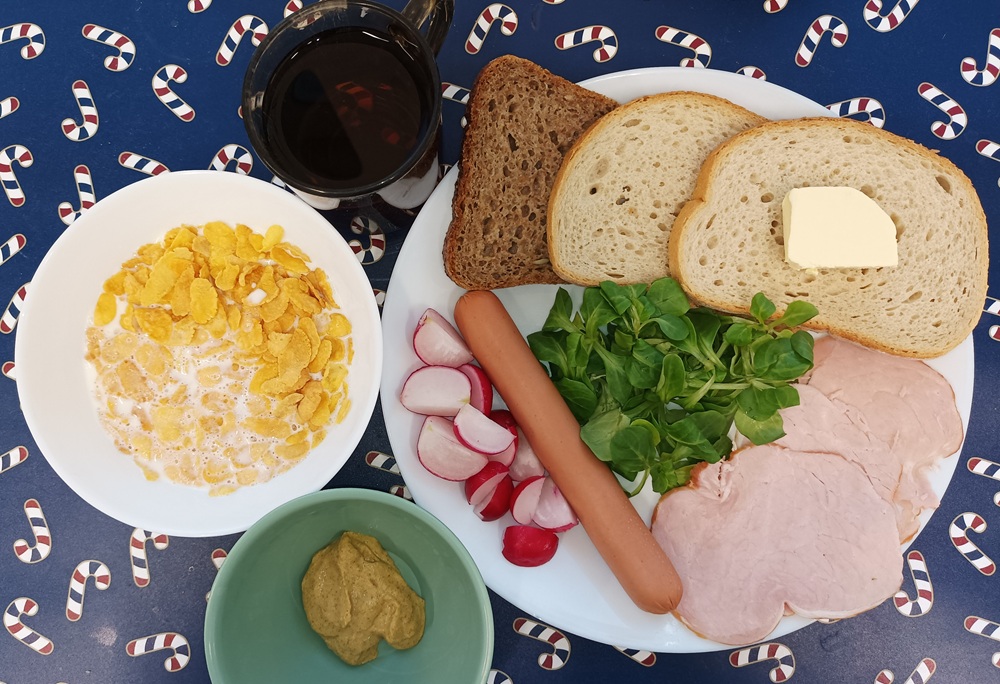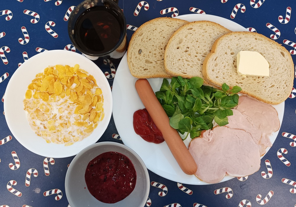 Płatki kukurydziane na mleku, Gotowana parówka z kurczaka z ketchupem, Kanapki z pieczywa pszennego z margaryną, polędwicą sopocką, roszponką oraz musem jagodowym, herbata czarna.
