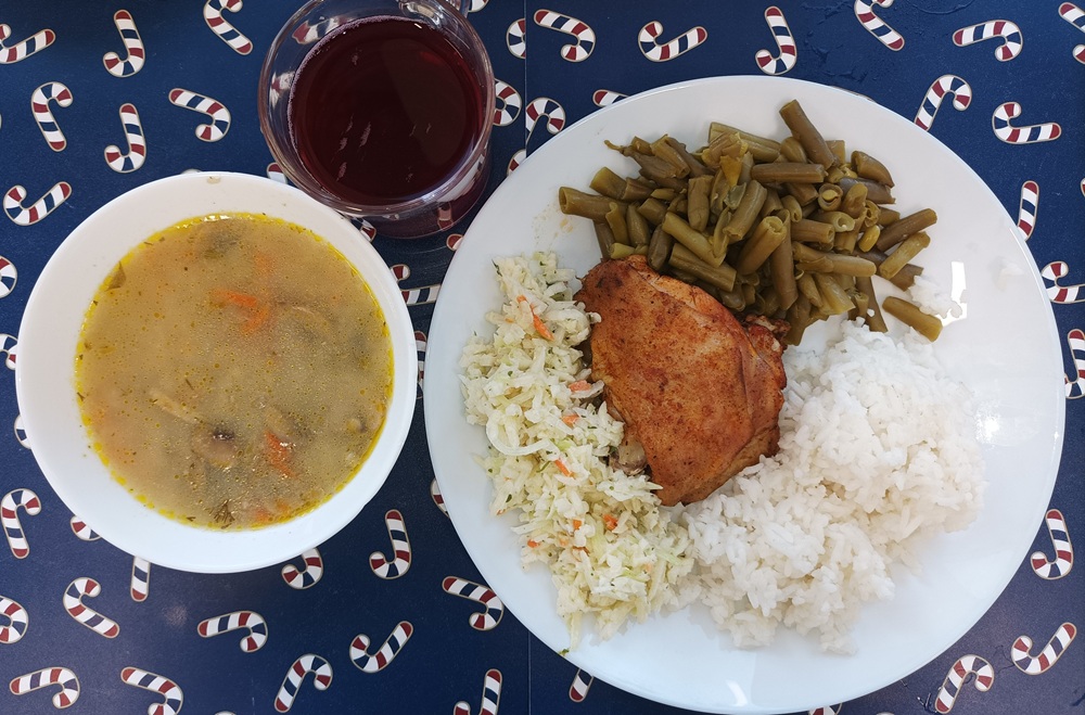 Dieta podstawowa: Zupa pieczarkowa, Pieczone udko z kurczaka z gotowanym białym ryżem, gotowaną fasolką szparagową oraz surówką colesław, kompot owocowy.