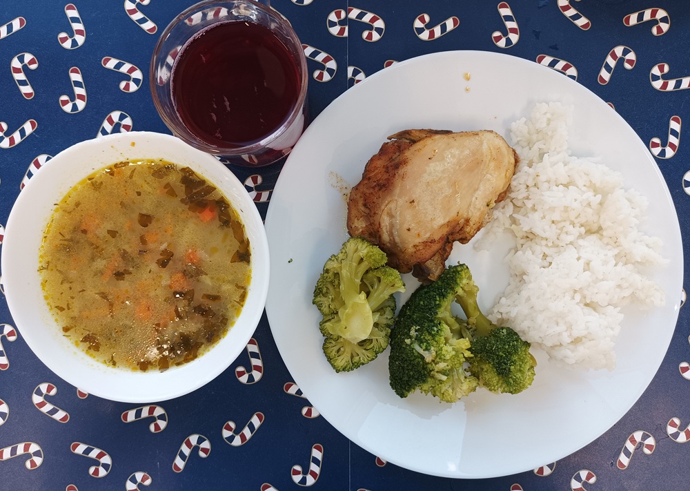 Zupa pietruszkowa, Pieczone udko z kurczaka bez skóry z gotowanym białym ryżem oraz gotowanym brokułem, kompot owocowy.