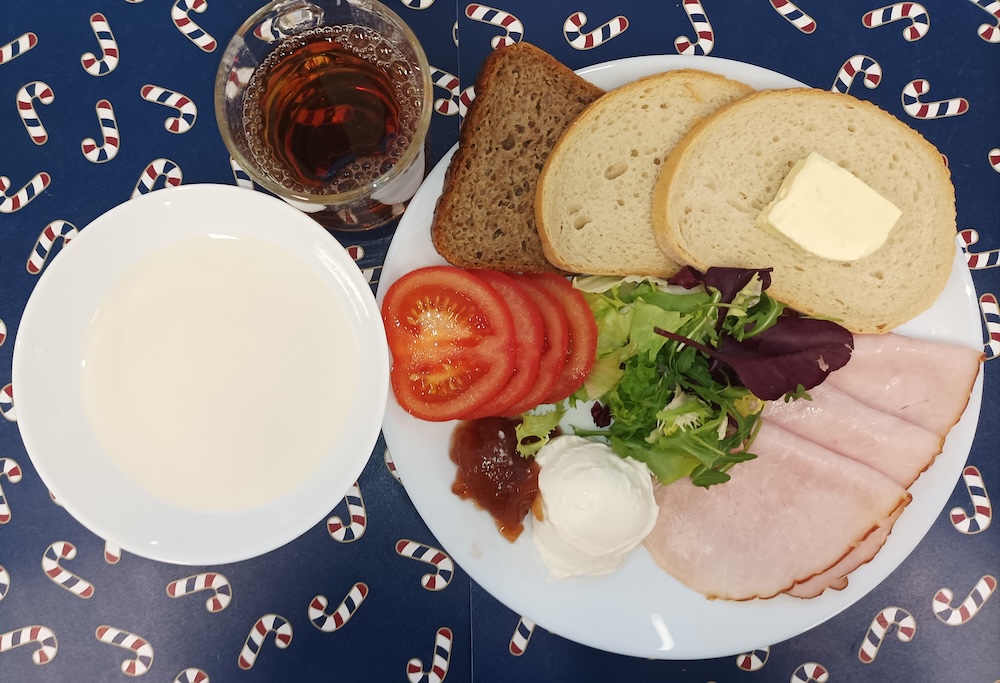 Dieta podstawowa: Płatki kukurydziane na mleku, Gotowana parówka z kurczaka z musztardą, Kanapki z pieczywa mieszanego z margaryną, polędwicą sopocką, roszponką oraz rzodkiewką, herbata czarna