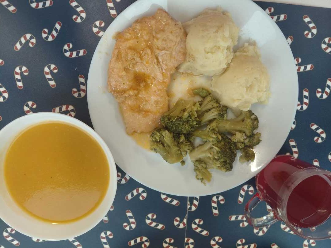 Obiad dieta lekkostrawna- zupa dyniowa, indyk w sosie własnym z ziemniakami i brokułem, kompot.