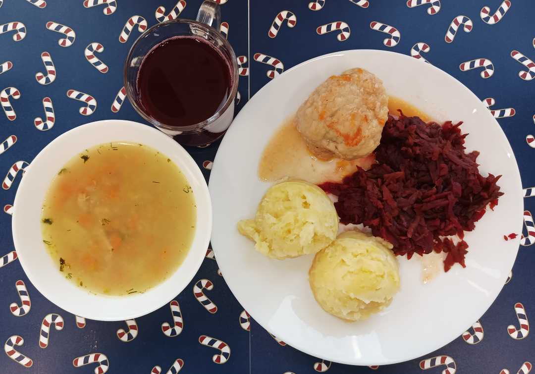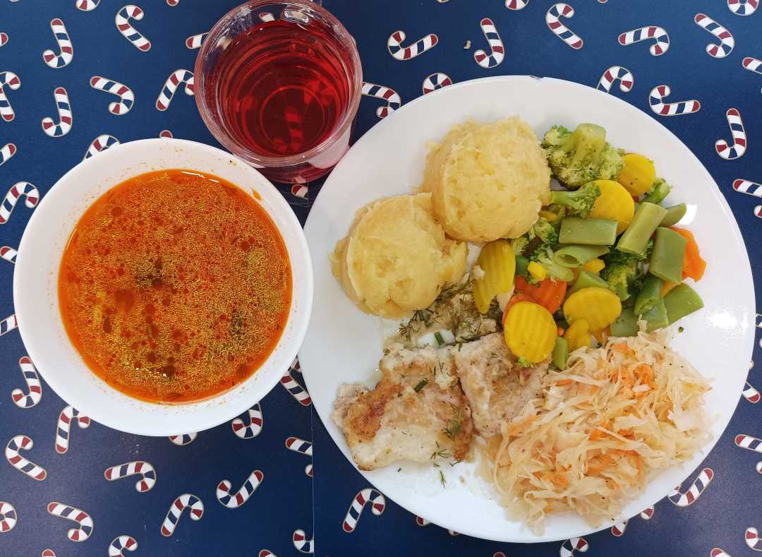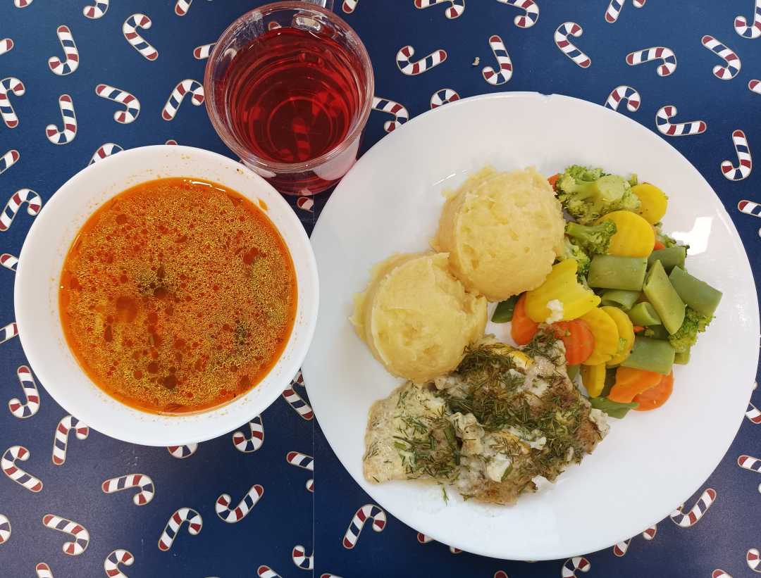 Obiad dieta podstawowa: Barszcz czerwony, Smażony kotlet z ryby z gotowanymi ziemniakami, duszonymi jarzynkami oraz sałatą lodową w sosie winegret, kompot owocowy.