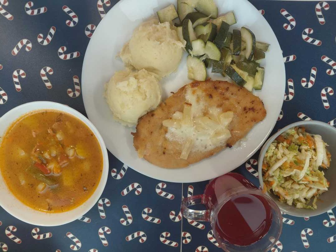 Obiad dieta podstawowa - zupa gulaszowa, sznycel z  indyka po hawajsku z ziemniakami, cukinią i surówką z kapusty pekińskiej, kompot.