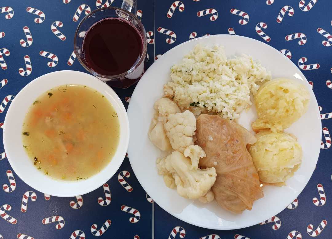 Obiad dieta podstawowa: Zupa brokułowa, Gołąbek w sosie pomidorowym z gotowanymi ziemniakami, gotowanym kalafiorem oraz surówką z selera i pora, kompot owocowy.