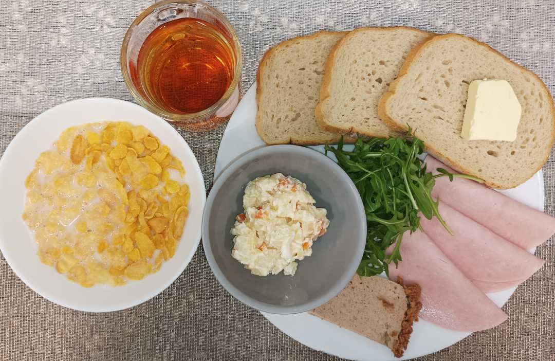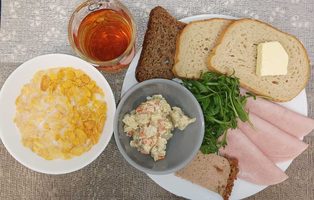 Śniadanie dieta podstawowa: Płatki kukurydziane na mleku, Kanapki z pieczywa mieszanego z margaryną, szynką wieprzową, pasztetem drobiowym pieczonym, rukolą oraz sałatką jarzynową, herbata czarna.