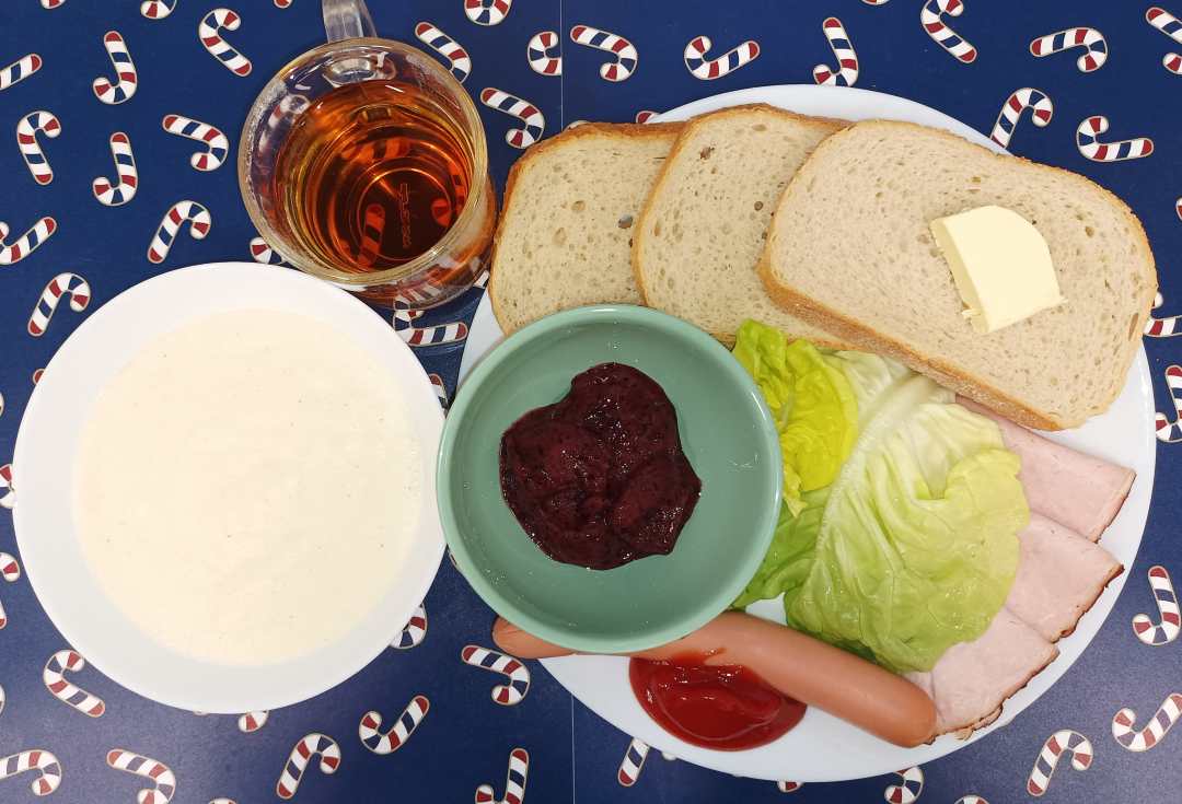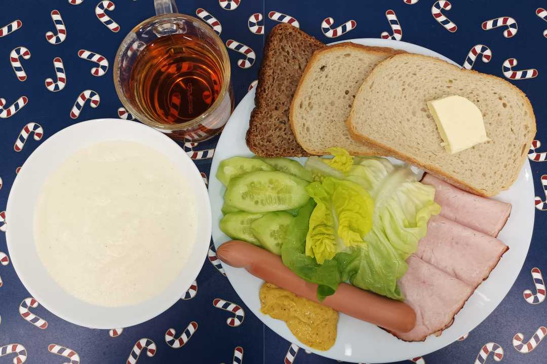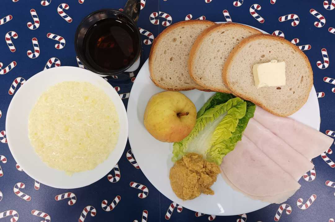 Śniadanie dieta podstawowa: Kasza manna na mleku, Gotowana parówka z kurczaka z musztardą, Kanapki z pieczywa mieszanego z margaryną, szynką wiejską, sałatą masłową oraz zielonym ogórkiem, herbata czarna.