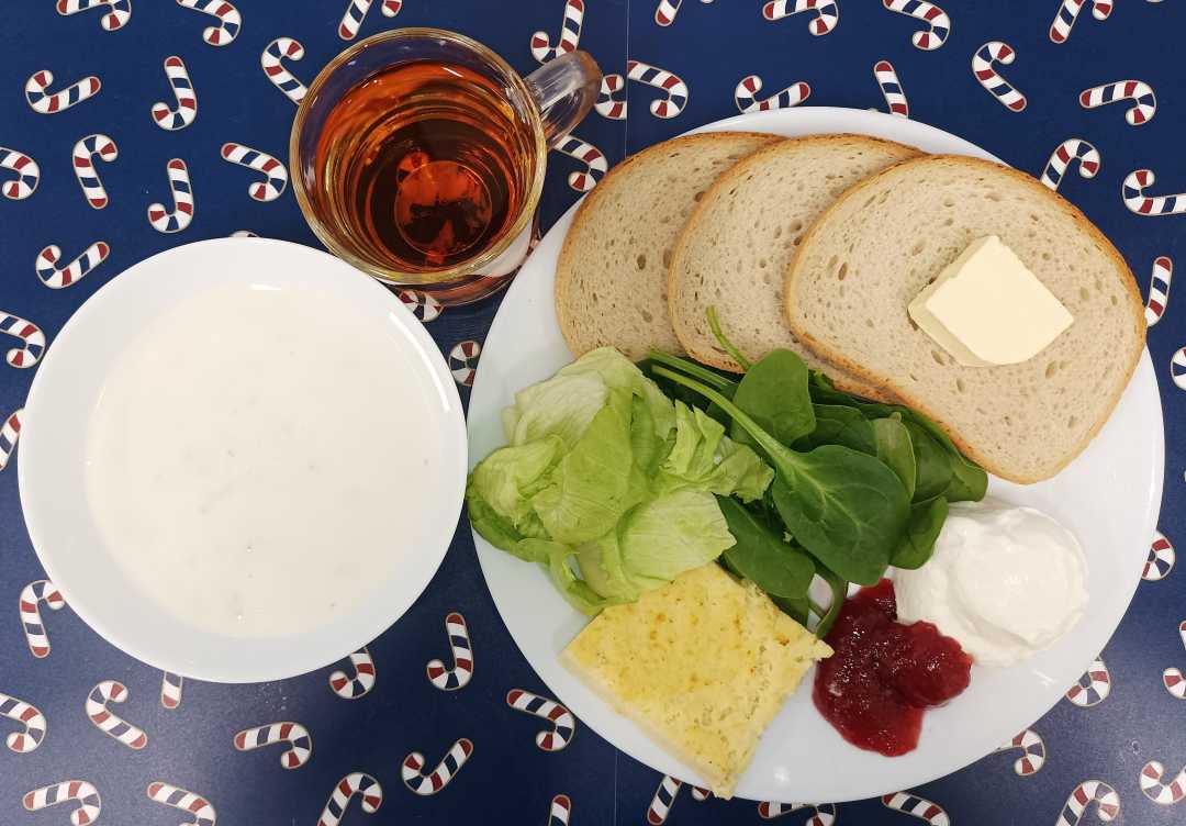 Śniadanie dieta podstawowa: Zacierka na mleku, Kanapki z pieczywa mieszanego z margaryną, szynką z piersi kurczaka, żółtym serem, sałatą rzymską oraz zielonym ogórkiem, herbata czarna.