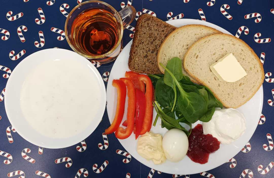 Śniadanie dieta podstawowa: Płatki jęczmienne na mleku, Kanapki z pieczywa mieszanego z margaryną, gotowanym jajkiem z majonezem, pastą twarogową z dżemem niskosłodzonym truskawkowym, szpinakiem baby oraz papryką, herbata czarna.