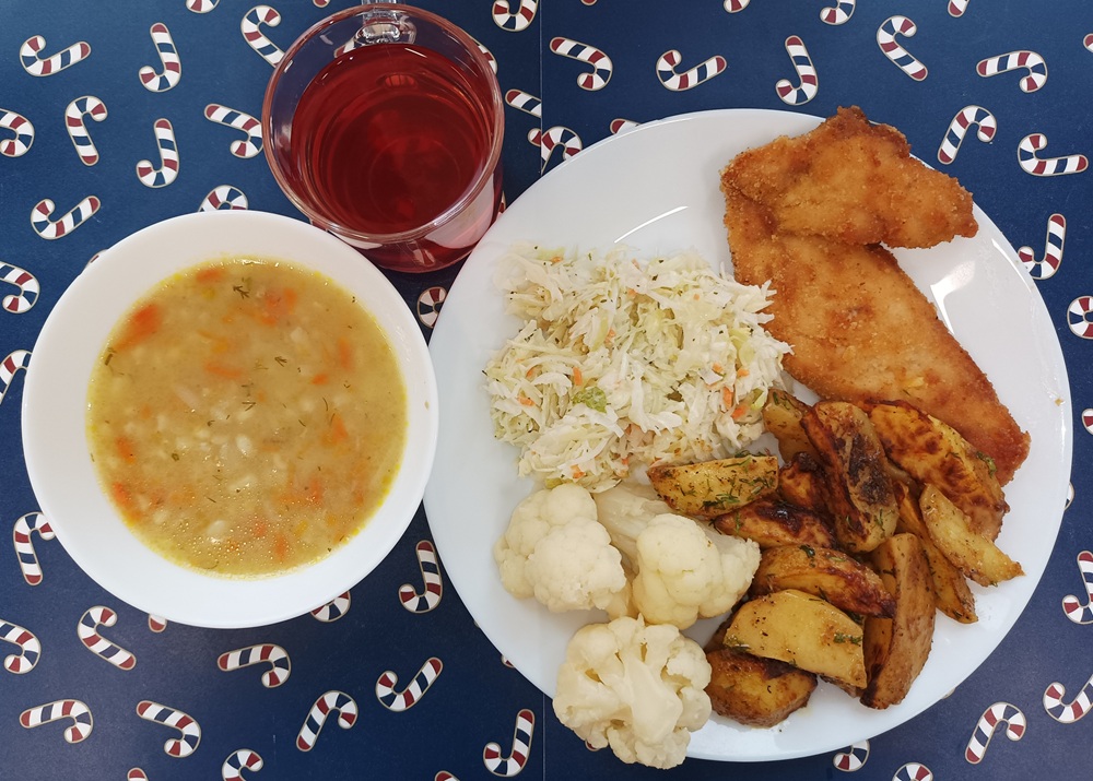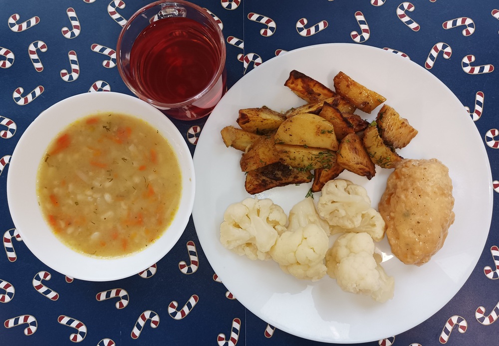 Dieta podstawowa: Krupnik, Kotlet z piersi kurczaka z pieczonymi ziemniakami, gotowanym kalafiorem oraz surówką żydowską, kompot owocowy